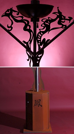 Der Phönix — das Symbol für Erfreuliches. Der Drache, als Beschützer gibt er Geborgenheit. Die Feuerschale, der Energieausstoß, die Krone - der Sockel, die Energiequelle, im Zeichen der vier Elemente Feuer, Erde, Wasser, Luft. Oberflächen-Korrosion der gewünschte Materialeffekt.